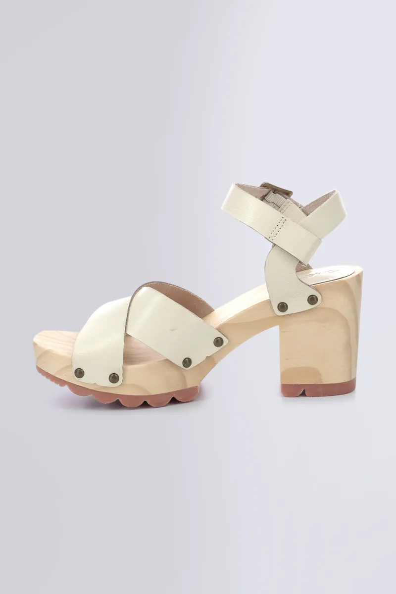 Conçues en cuir à tannage végétal, ces sandales révèlent deux brides croisées sur le dessus du pied et une bride à boucle ajustable autour de la cheville pour un maintien sur mesure. Leur semelle en bois naturel et leur talon de 8,5 cm offrent un équilibre parfait entre style et confort.