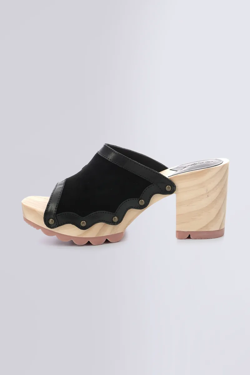 Conçues en cuir noir à tannage végétal, elles s’enfilent facilement et offrent une sensation agréable grâce à leur semelle intérieure en bois naturel. La semelle extérieure en caoutchouc assure robustesse et adhérence, tandis que le talon en bois de 8,5 cm allonge la silhouette avec élégance.
