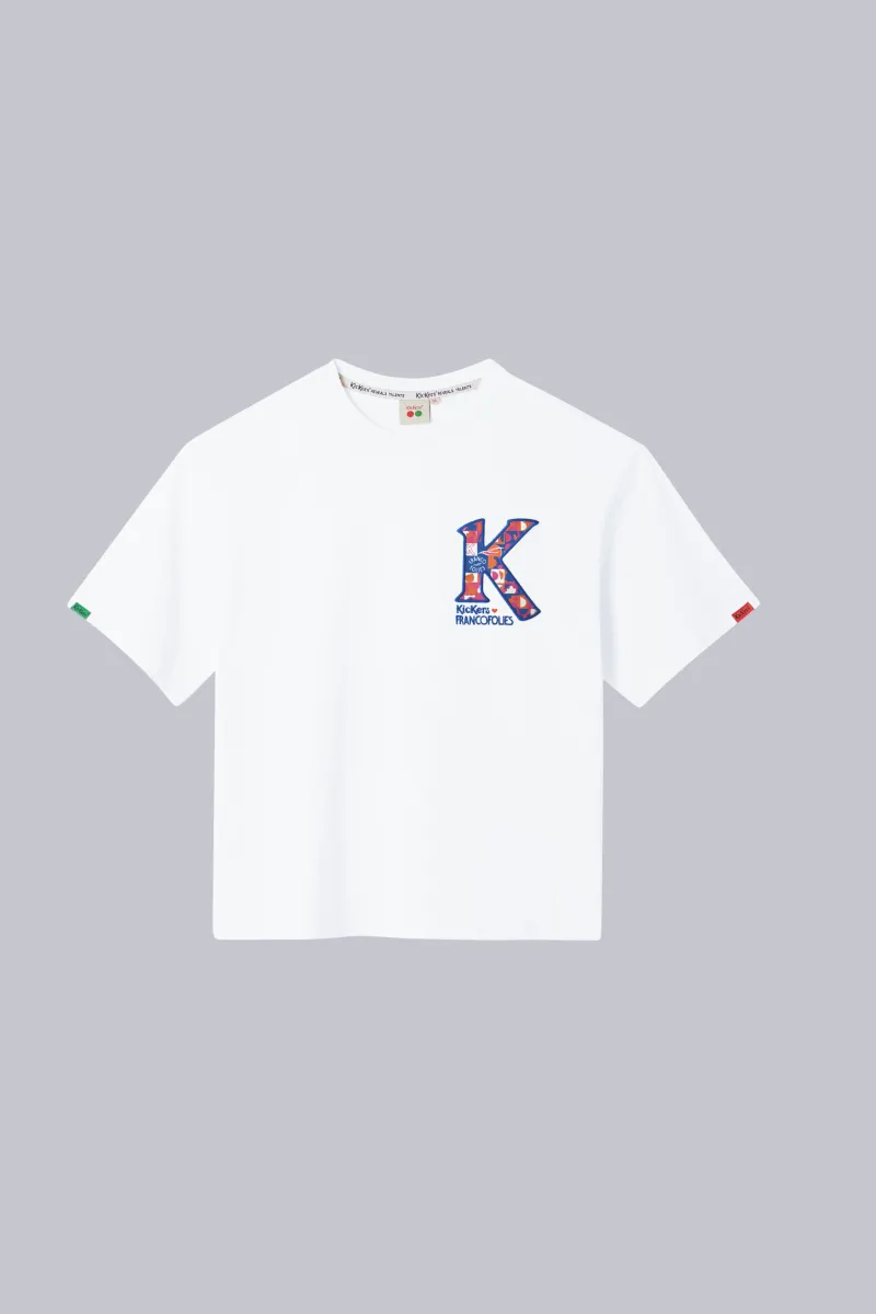 Sa coupe oversize ultra actuelle apporte une allure décontractée et cool, parfaite pour chiller ou danser jusqu’au bout de la nuit. Sur le devant, un grand « K » multicolore : dans des teintes estivales de bleu, orange et rose, insuffle une vibe solaire et joyeuse. En contraste, les logos Kickers x Francofolies brodés en bleu marine signent cette collab stylée avec subtilité.